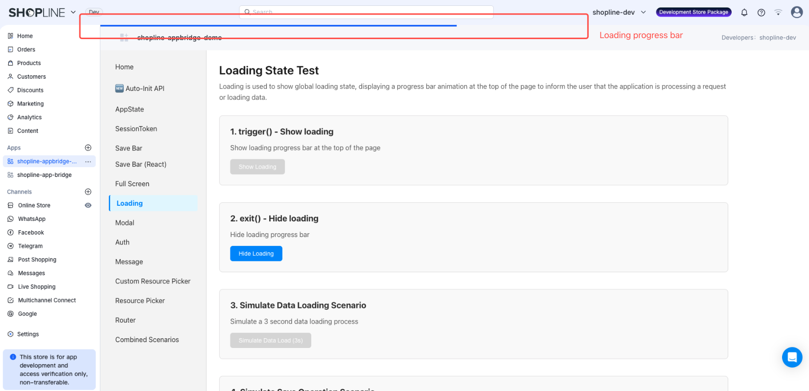 Loading is a component for displaying a global loading state. By showing a progress bar animation at the top of the SHOPLINE Admin, it informs merchants that the app is processing a request or loading data. This helps effectively manage expectations, letting merchants know the app's response status and preventing uncertainty due to waiting.