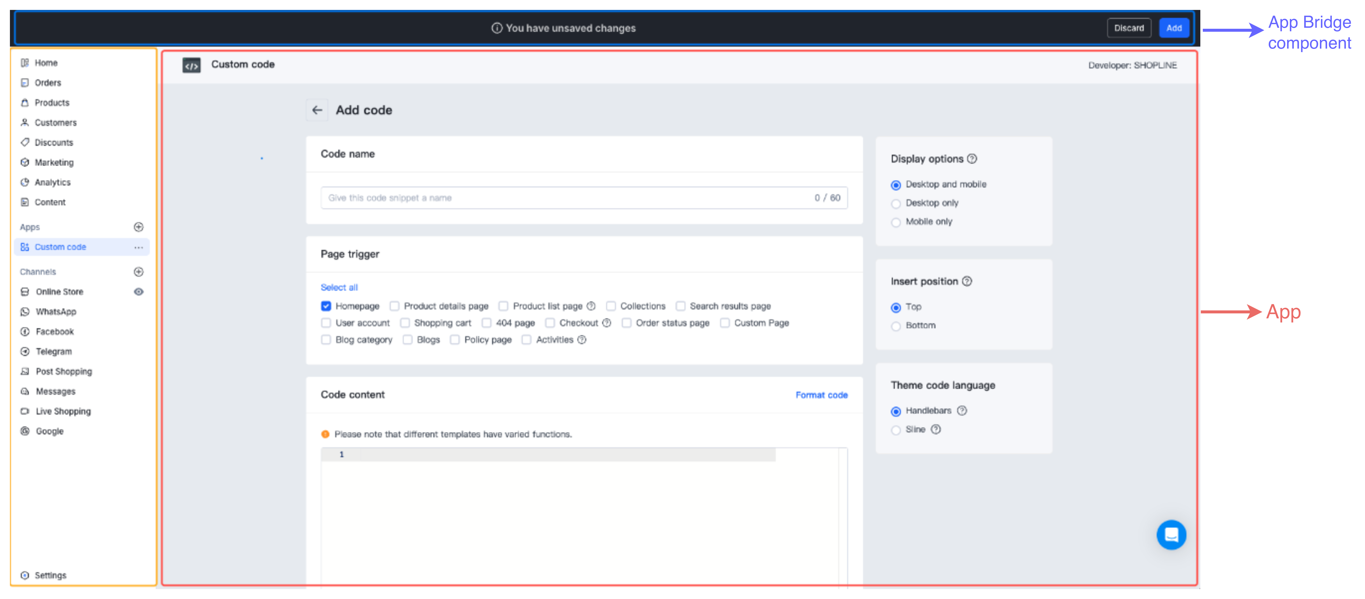 - Central main area (marked with a red box): Your app embedded into the SHOPLINE Admin via an iframe, hosting its own independent interface and business logic. The figure shows an example page of an app named Custom Code.