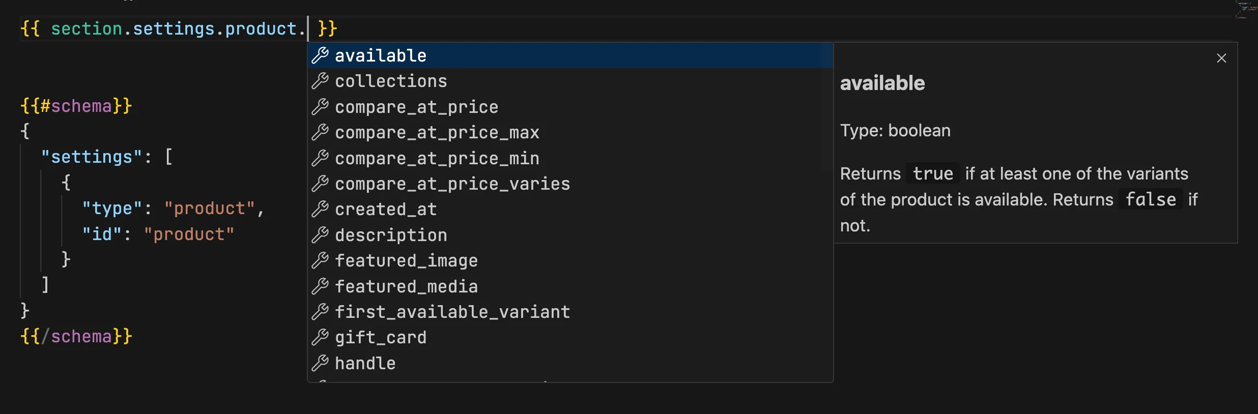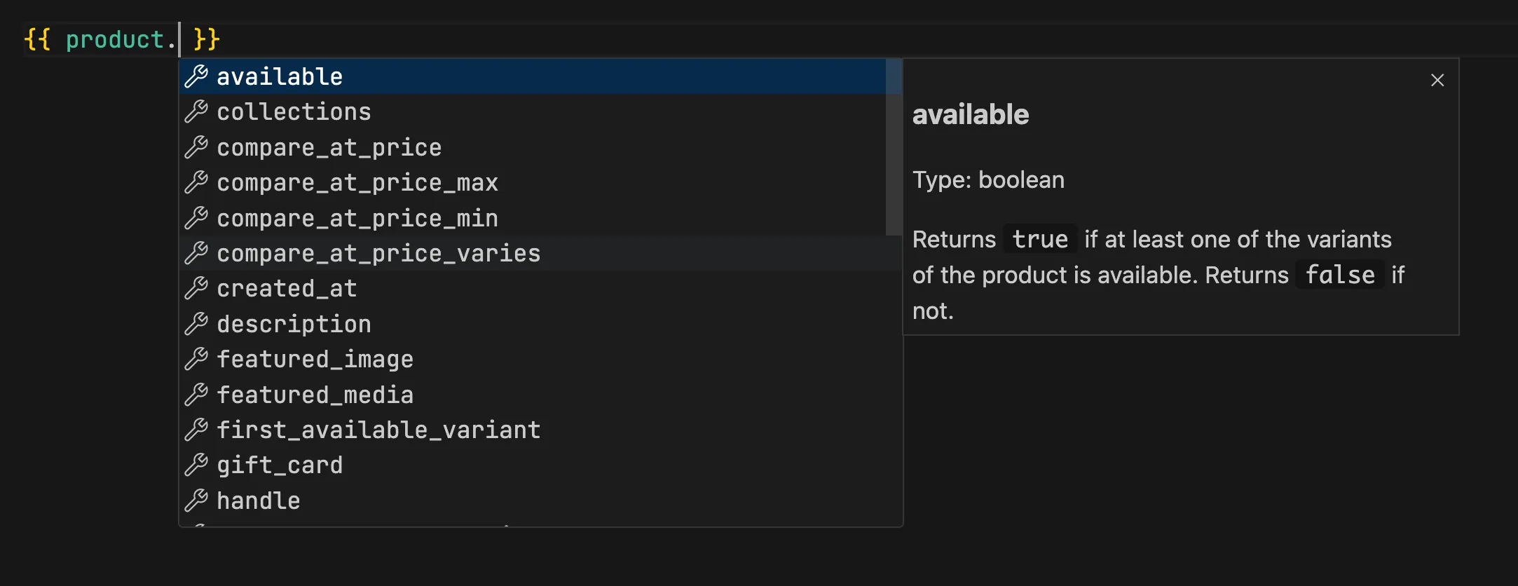 When developing any .html file, if you input any object, its properties will be suggested and displayed for selection. For example, the properties of a product object are shown as follows: