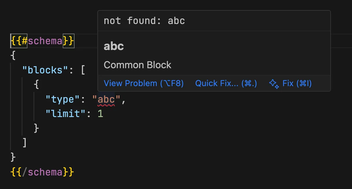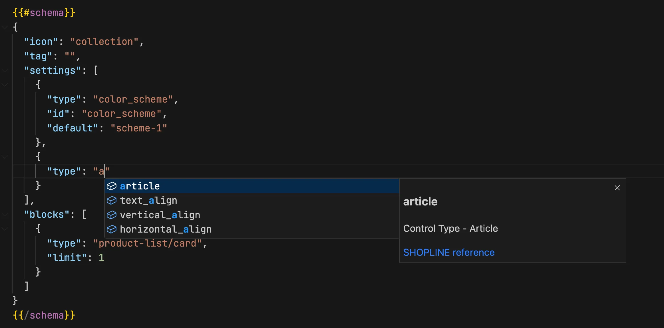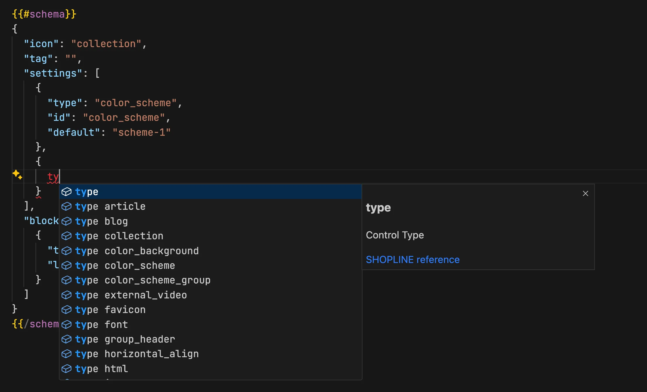 When writing schema configurations, entering type will trigger preset code suggestions for all control types.