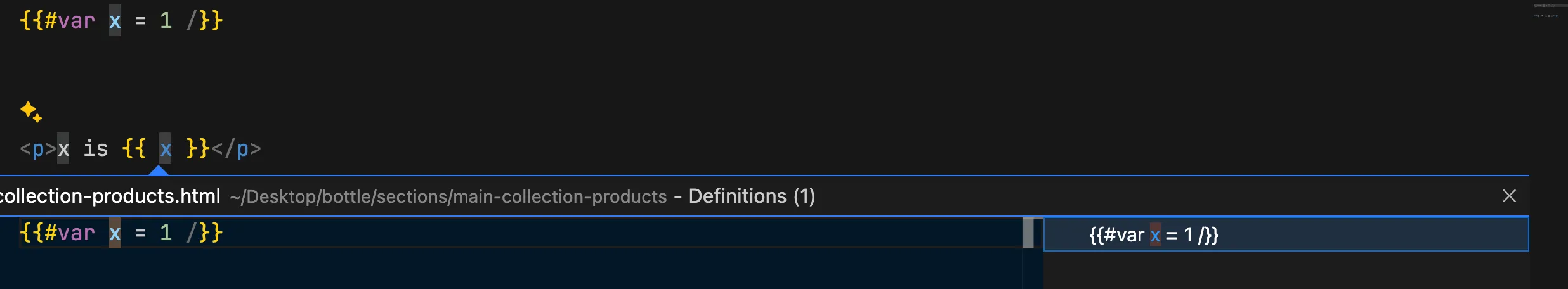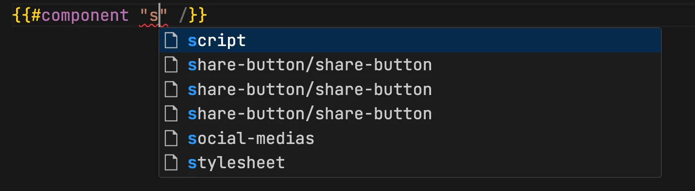 When developing any .html file, typing {{# followed by some characters triggers a list of tag suggestions. Press Enter, and the code snippet for the selected tag is automatically inserted.