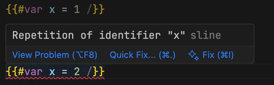 Declaring a variable more than once within the same scope triggers error diagnostics, as shown in the following: