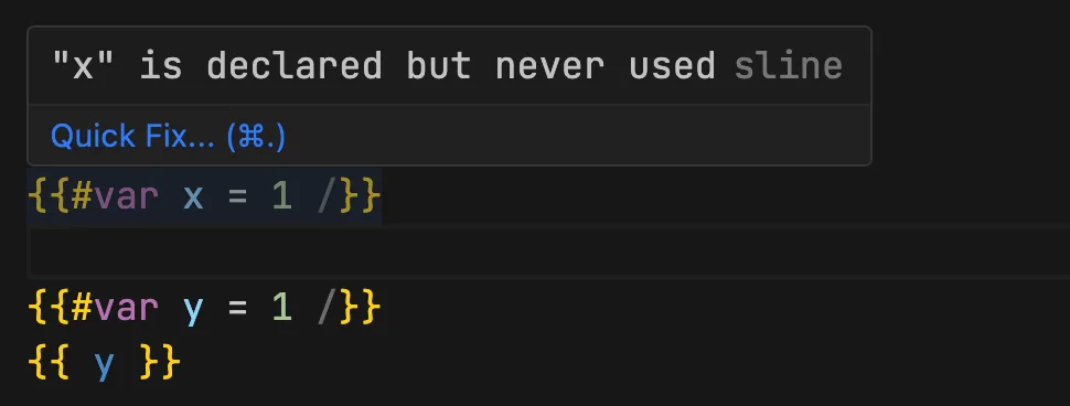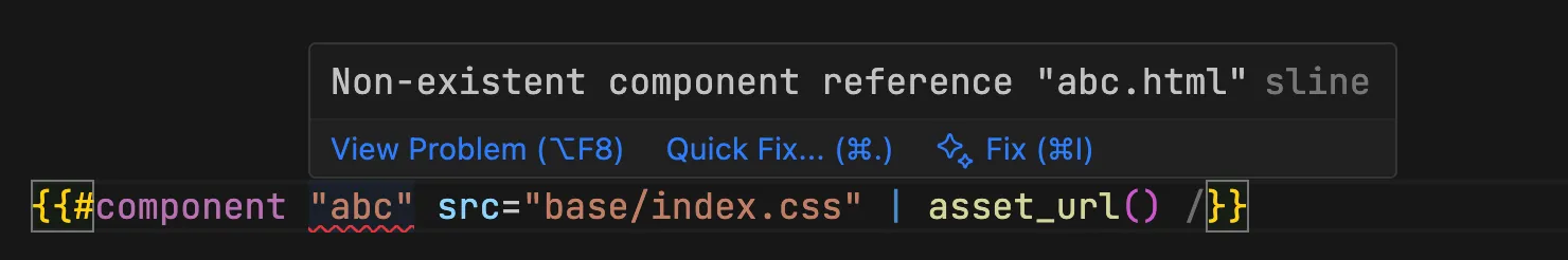 When you use template variables, automatic checks for basic syntax errors are performed. For example, a missing closing }} in a tag will trigger error diagnostics, as shown in the following: