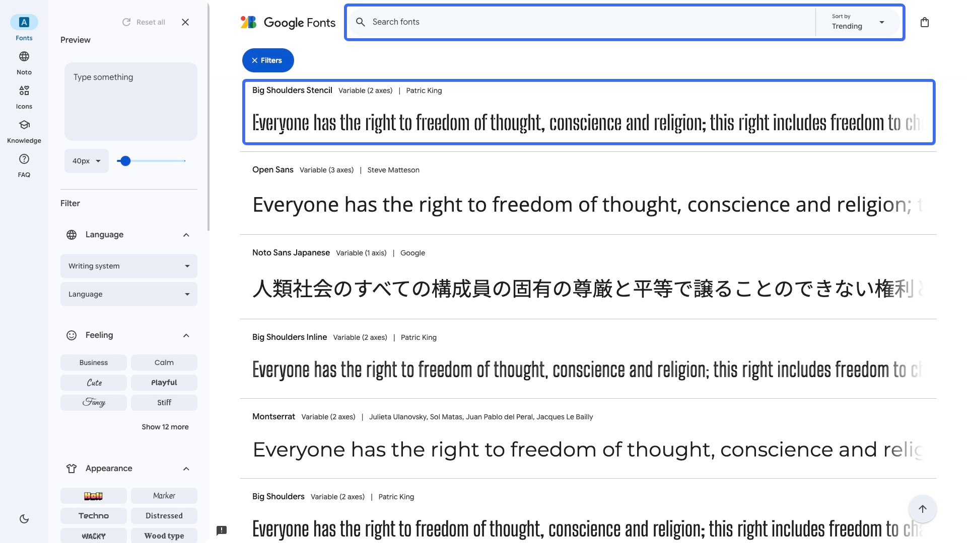 - 在 谷歌字体 官网中搜索你想要的字体,然后选择你想要的字体: