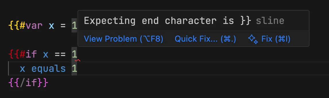 在使用模板变量时,自动检查基础语法错误。例如 Tag 少了结尾的 }} 会提示报错。如下图所示: