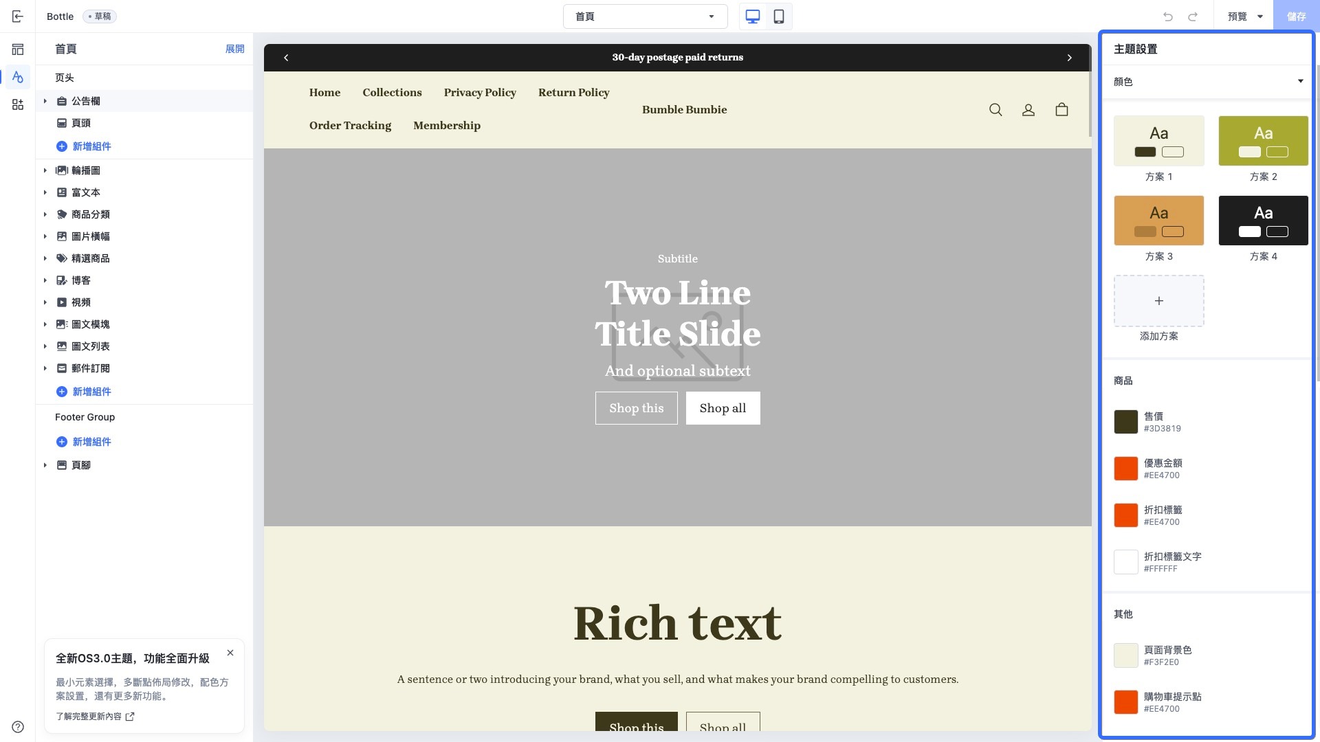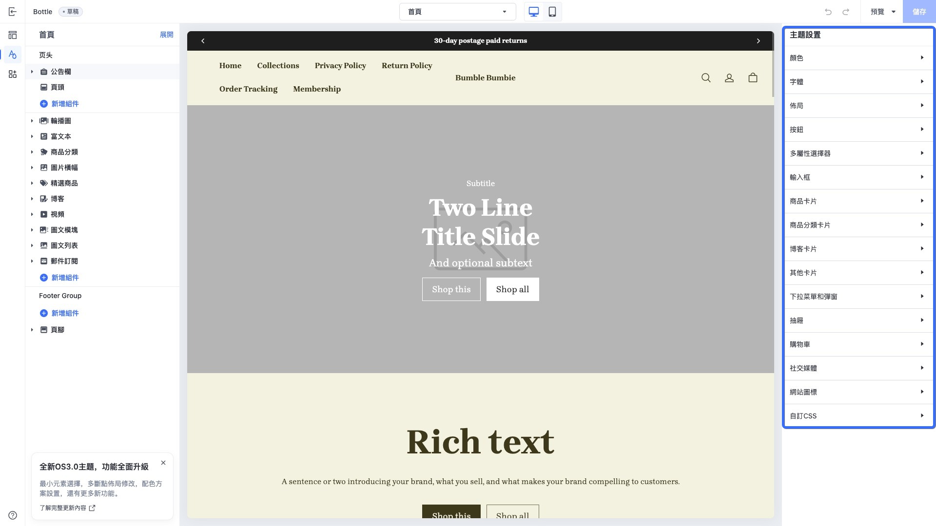 以下是主题 Bottle 在编辑器中的全局配置界面截图: